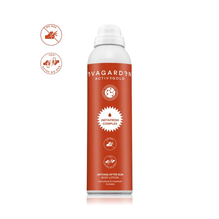 Voor een instant zijdezachte, gevoede en gehydrateerde huid. De vloeibare roomtextuur in de innovatieve spray-zonder-gas verpakking voelt niet vettig aan en geeft de huid direct verfrissing door het instafresh complex. Deze aftersun is ideaal om de huid zijn natuurlijke hydratatie en gezondheid terug te geven, die vaak verslechterd wordt door droogheid vanwege blootstelling aan de zon. Geeft ook onvoorziene bescherming tegen vrije radicalen en huidveroudering. De zachte geur doet meteen denken aan de zon en vakantie. Paraben Free, Dermatologically tested, Cruelty Free, Vegan friendly, SLS-free, SLES-free, Mineral oil-free, Artificial Dyes Free, D5 Free, Talc Free, Pao12M. EVAGARDEN INSTAFRESH COMPLEX: Een fusie van Ureum, plantaardige glycerine, rijstolie, Bisabolol, Glycyrrhetinezuur, Kamille-extract, Calendula extract, panthenol en allantoïne, creëren een complex van actieve ingredienten om de huid instant gezonder te maken na schade veroorzaakt door blootstelling aan de zon. 150ml
